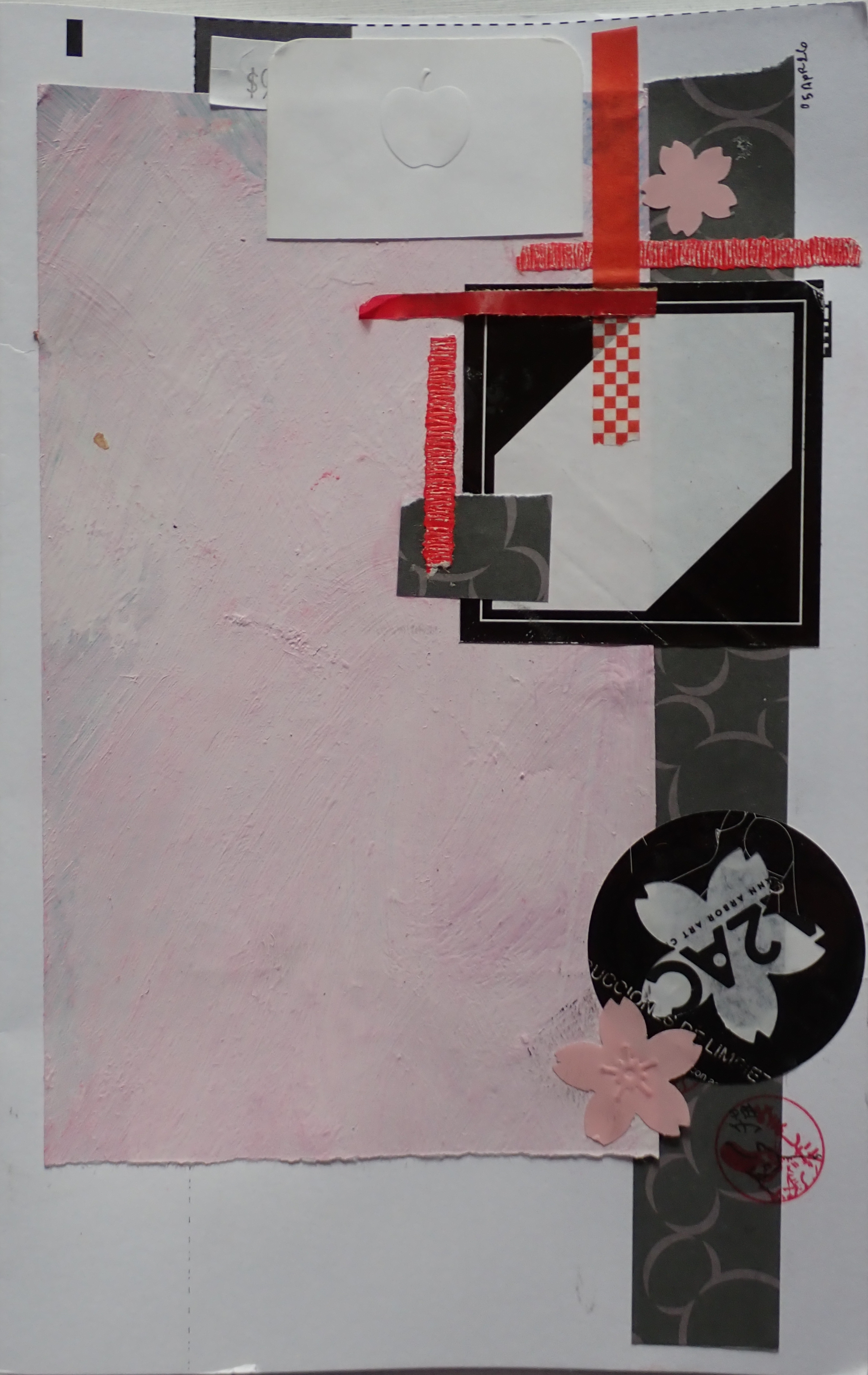 The other rather interesting-to-me component is the red strip with the white crinkles. This was from the envelope, IIRC from the wireless hotspot I ordered for my 2024 trip to Japan, and was the bit that peeled up from opening it. Or something. When I split the paper to remove most of the thickness, the red ink shattered from bending stress, yielding this enticing pattern, which I accented with some red tape from something-or-other and some red and white checkered washi tape. A commercially made embossed business card combined with dekop's embossing sakura punches used on the pink ‘background’ of some dizzy stickers finish things off. (I guess after I finish punching out my own stickers from the available backgrounds, I'll donate themickey & minnie mouse stickers that are the actual product;)