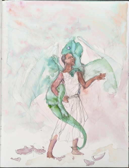 It's likely no better a solution than Whelan's but for the moment, it's my preference, not least because dragons look more like dinosaurs (of which birds are the modern example) more than anything else, so even though bat wings make a lot of sense for a featherless animal, I relied more on bird anatomy for underlying wing structure; after working that out, then I had to figure out what the human character looked like, since all the text says about him is that he's the biggest in his class and he's dark skinned. Oh, and that he has nicely muscled arms. So, slender or stocky? Handsome or plain or somewhere in between? The admiration for his arms comes up in the context of a girl his own age admiring them, so his facial features are probably fairly typical; but is his head round or long or heart-shaped, are his lips thin or full, his nose and mouth wide or narrow, his hair straight, curly or wooly?