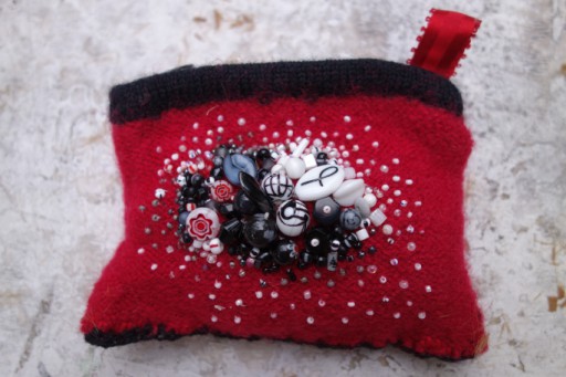 Like the rhyolite/unakite pouch that started this series of beaded embroidery posts, the red, black and white necklace I made in July also yielded lots of leftovers, especially lampwork. I had a felted sweater in just the right colour, and I reasoned that nice thick, softly felted wool would be both strong and easy to embroider—and like my stockings, wouldn't even require me to use an embroidery hoop! I also started incorporating what I thought of as the“sprinkling technique” that I first started using the brown silk pouch.