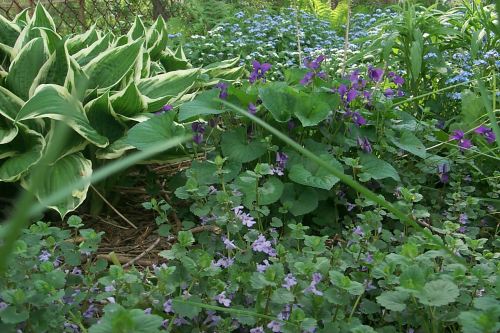 Those pretty lavender flowers in the foreground are also a weed, gill over the ground. I think I ripped it out shortly after it bloomed. Not to worry; it always comes back. Also in the photo are some not-yet-slug-chewed hostas and perennial forget me not, another good performer if only I would divide it and throw away the dead center....