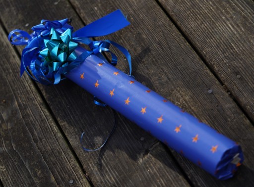 This is a simpler wrap job than the one I featured a few days ago, with just bows and curling ribbon: