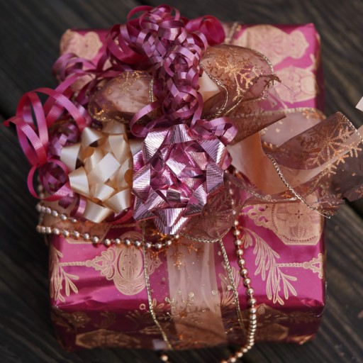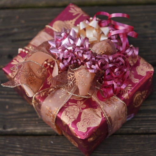 another view, gift decoration, old-gold foil on burgundy paper; mylar and sateen bows; wire edged, curling, synthetic and ribbon; bead strand; wrapped, photographed 25dec23, sony ILCE-7C, sony 90mm macro, f/2.8, ev -0.3 ,1/320s, ISO 200, WB: cloudy; rotated slightly, cropped in gimp
