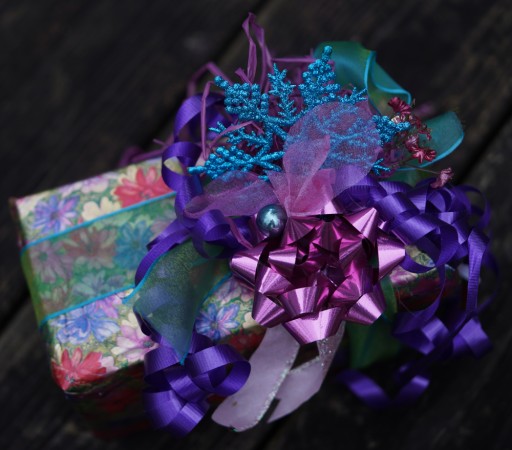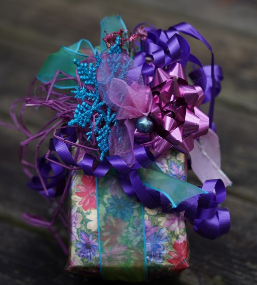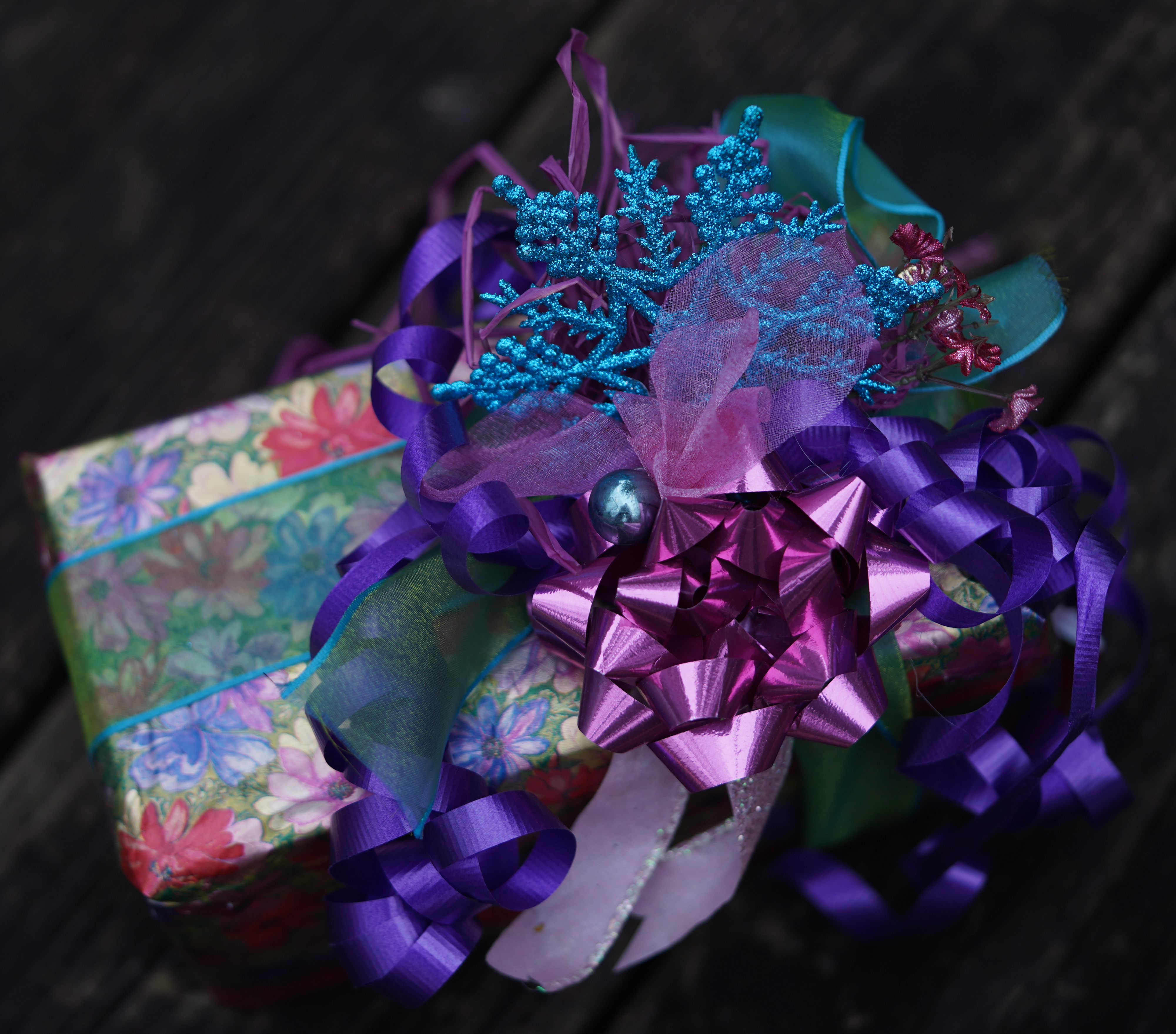 foil textured floral wrapping paper; raffia, curling, pink woven and bicoloured transparent mesh ribbons; transparent mesh rose petals; vintage 12mm ornament; metallic fake flowers; turquoise glittered snowflake ornament, hot blue, tape; 01jan24, sony ILCE-7C, sony 90mm macro, f/2.8, ev -0.3, 1/100s, ISO 250, WV: daylight; rotated, cropped, scaled in gimp