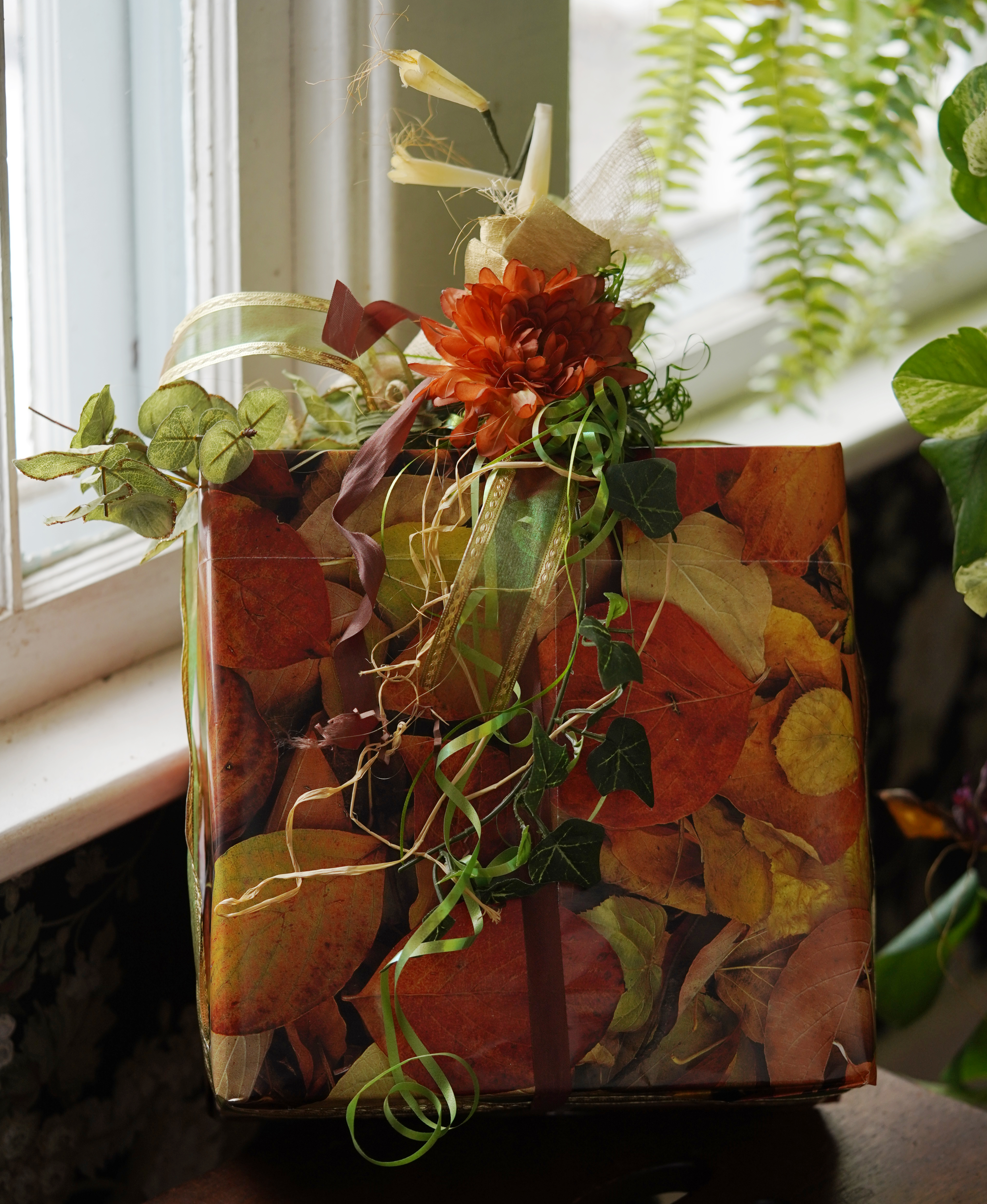 giftwrap featuring autumn leaf wrapping paper, crepe paper, assorted ribbons, silk flowers and leaves; 29nov2025; photographed 30nov25, sony A7c, sony 90mm macro, natural light; f/2.8; 1/100s, ISO 320, ev +1.0, WB: cloudy; light levels adjusted, cropped and scaled in gimp.