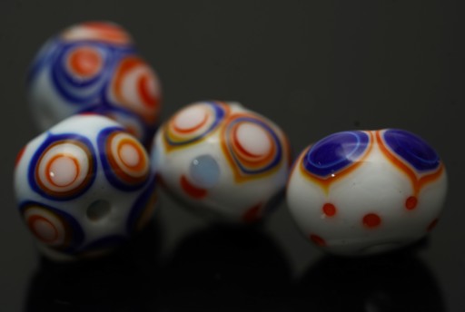 The basic idea with this challenge is to use heat only (no tools), and I don't know and don't recall whether I marvered down the dots for these beads: given the lumpiness, possibly not! Because these are hollows (albeit with thick walls) melting in the dots is a real chore, so I do sometimes mash them to speed things up a bit. Note also that, like Tsang Sather, I'm using a three rather than two colour combo.[1] I made 5,[2] of which 4, I thought, were worth photographing. It would be nice to make some more once the weather warms up:)