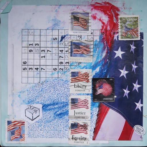 It features a failed sudoku—my spouse is really good at them, and they were definitely a pandemic activity; after a while we switched to apps, but initially, he printed them out, and I saved the filled out sheets for collaging. Lots of flag stamps[1] , a ballot box icon that our City Clerk likes to put on election materials, the back of an envelope, a bit of flag torn from some mag or other, colored pastels (haven't really explored using these much, but I'd like to) fixed with glue, and...a made in China sticker.