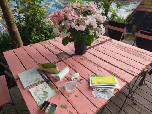 The delightful patio on which I made this piece. So serene...Here you see my pencil holder, a waterbrush, my mini-altoids assortment of watercolours, and a 4x6 (postcard size) ‘Fluid Easy-Block’ edge bound water-colour paper. Chiemi-san also gave me some Japanese postcard watercolour paper she had lying about, which I absolutely adored—just a beautiful ivory colour, and who knows how old...? From the right edge of Yuki's portrait, I deduce it was made on this lovely vintage paper.