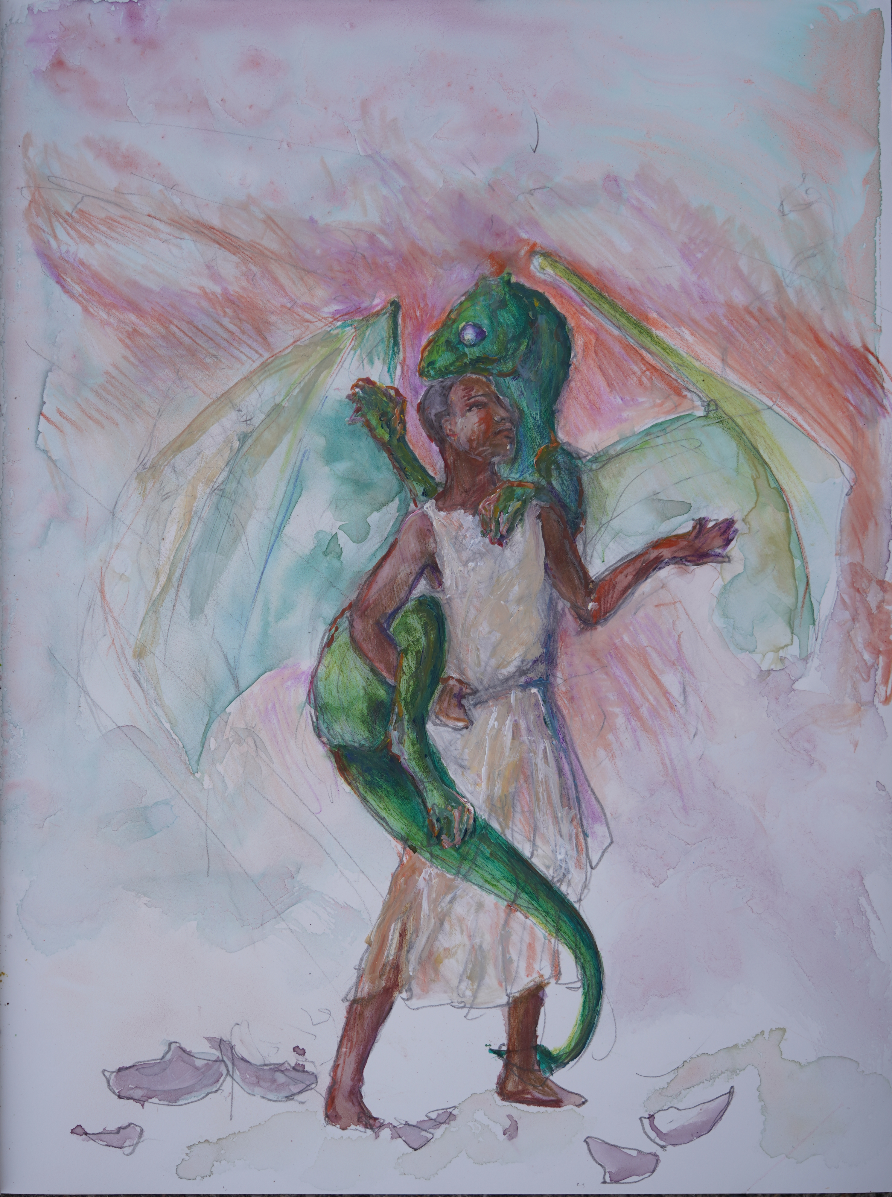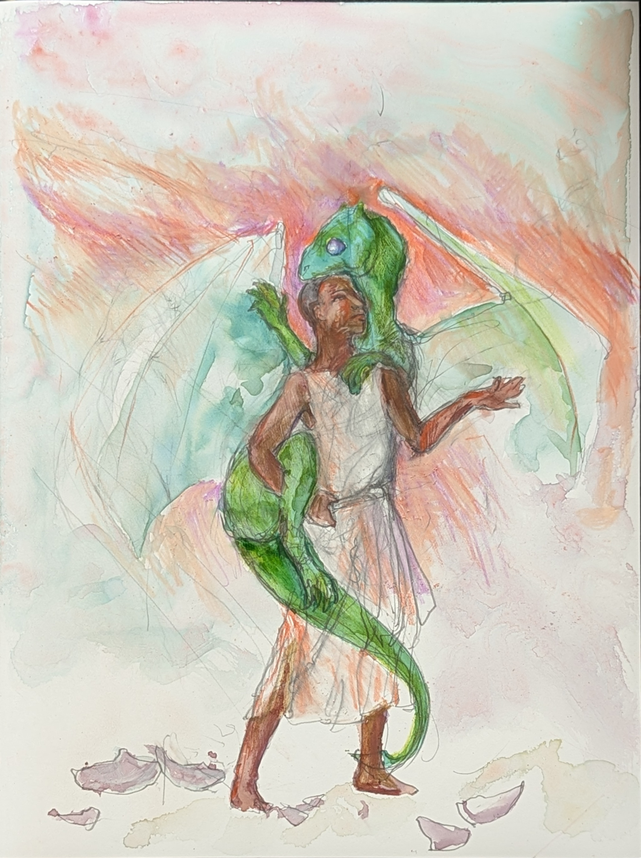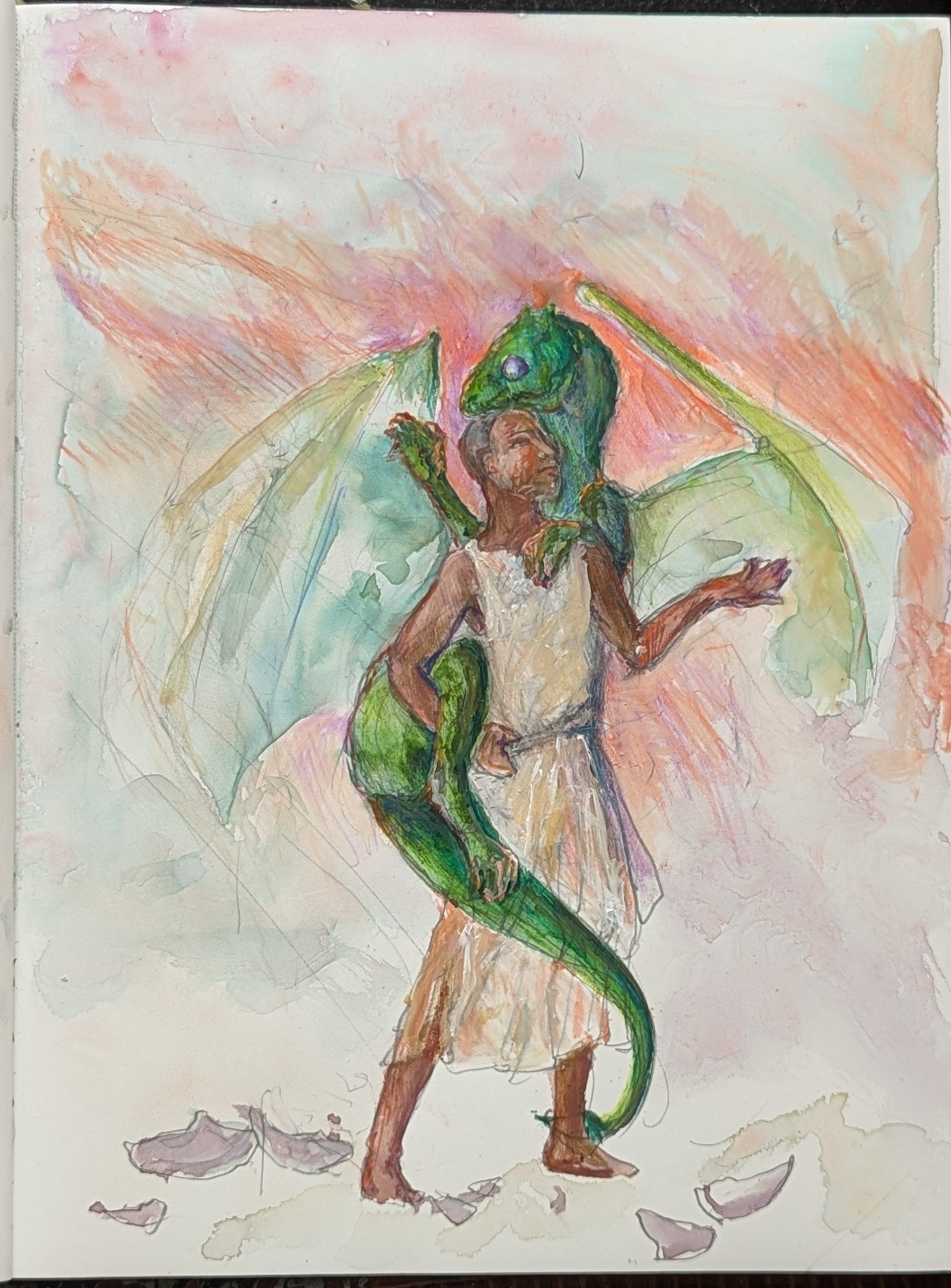 2nd instance: adding pastel pencil layering on the watercolour. Honestly, at least using the photographs to judge (not the same as the actual, physical art!) this version is probably my fave, despite that dreadful right foot of Kistrith's!