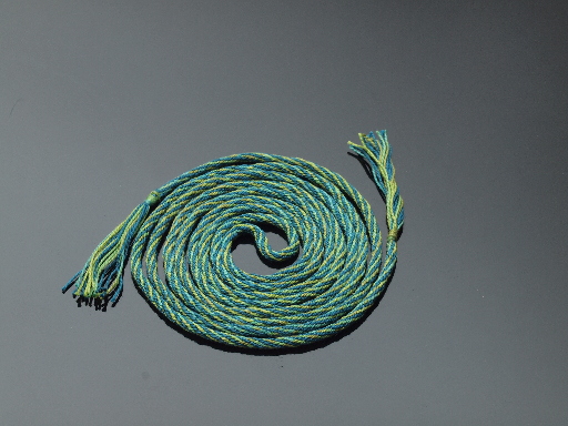 The completed braid is 68" (more or less unstretched) with 2" tassels, one of which I added using a tapestry need & scraps cut off the 2nd end, which finally totally completed the braid on 26mar17 The braid is 63%[2] of the original strands, which is fairly obviously from its soft & stretchy nature—to get really firm braids, I have to use the much heavier tama & fukaro available to me on the marudai.