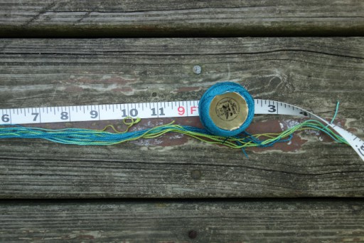 #5 perle cotton; the multi-color gold-green is a DMC hank from Jo-Ann/Michaels. 16 strands, (8 & 8) starting length 9’