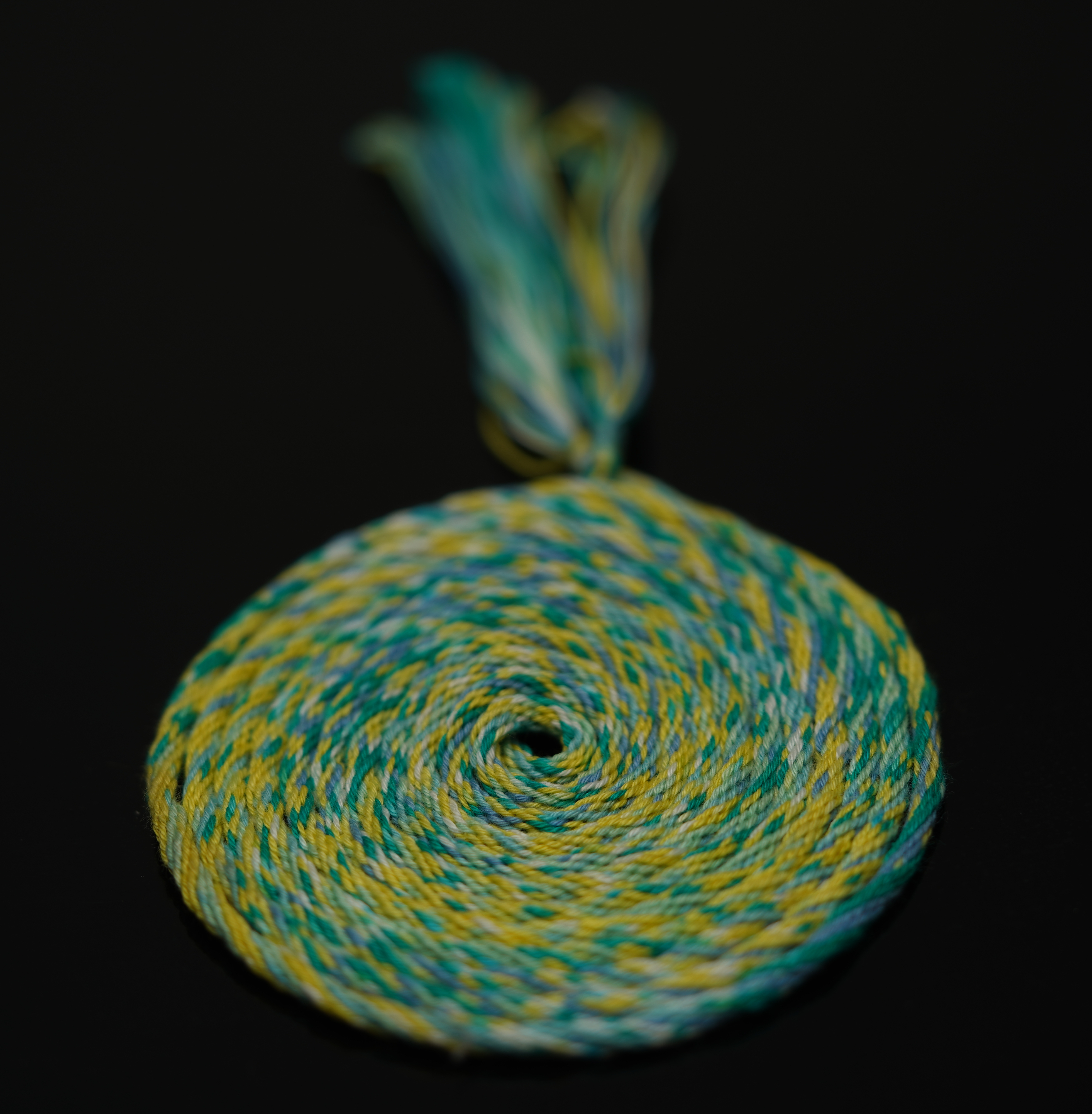 lime, yellow, emerald and aqua braid, sony A7c, sony 90mm macro, godox TT600 flash, 1/2 power?; f/8.0, ev 0, 1/160s, ISO 50, WB: flash; cropped in gimp