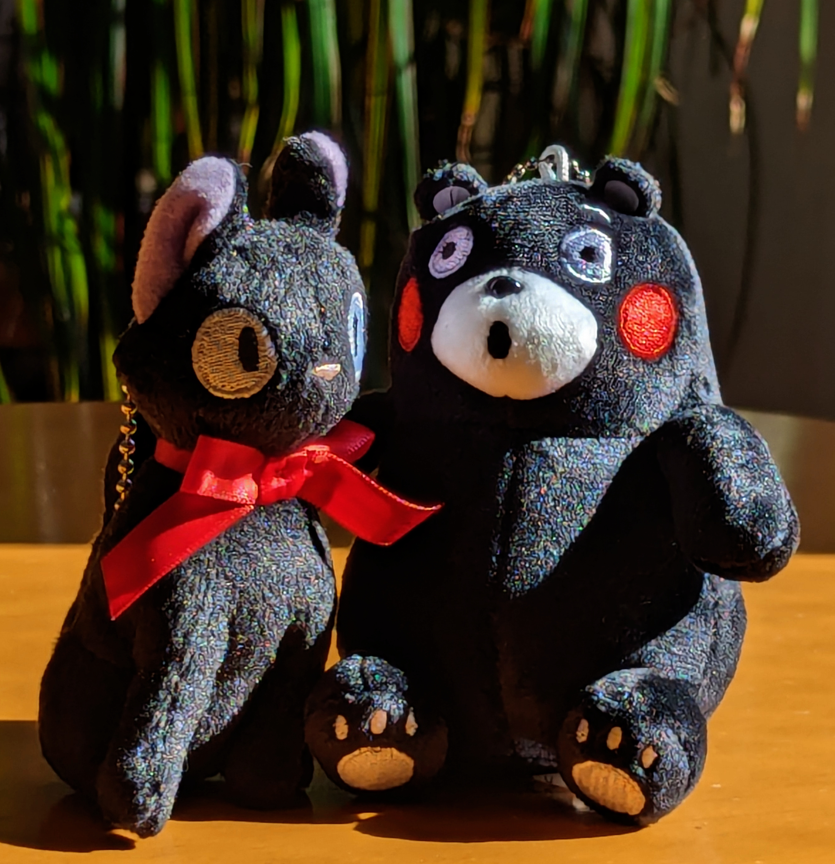 Kumon with friend (Jiji from Kiki's Delivery Service, courtesy of Ghibli Park:)[2] These little stuffed critters, some 3–4" (75–100mm) high, are very popular backpack or jacket decorations; I got these as souvenirs for the wizard:) pixel pro 6 cropped and value adjusted a bit.