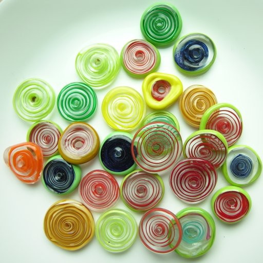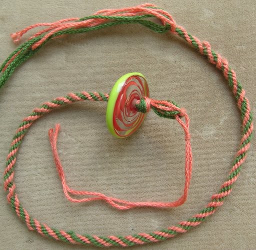 The pattern I used to teach the kids requires a button or bead stopper, so in lieu of exotic vietnamese snacks, I thought I'd make the beads, as a similar sort of premium. I wanted the braid to be short, so it would be more manageable (e.g. so the threads wouldn't tangle) and so the project came together as a bracelet. I owe Kristin Perkins big time for this one—she makes gorgeous disk beads, with concentric rings of various opaque and transparent colors that reveal a real genius for playful color. She's also recently come up with a simple chain bracelet with one disk bead. I've always thought it would be cool to make disk beads with spiral designs; and thought a friendship bracelet with a single focal bead on one end (around which the other could be tied) would be nice. And the kids wouldn't mind (too much, I hoped) that the beads would be imperfect.