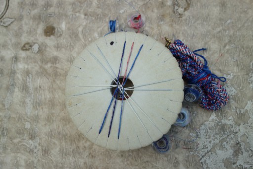 I added single strands of (unwound) #25 metallic embroidery floss to some of the strands, and they proved a major PITA, as they didn't stretch and the cotton did, meaning they fell off the bobbins, snarled the windings, etc. Never ever doing that again, at least not on a disk. ISTR it's less awful on a marudai.[1]