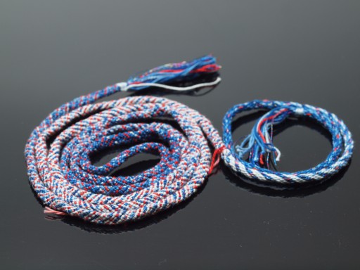 Update, 22mar17: braid photographed around 20mar17, though it was completed much sooner[2] —46" unstretched for tabby, another 11" for kongo, which was just to use up the 12? long remaining strands, rather than wasting the thread, or, tbh, my time in warping them, for a total (w/o tassels) of 57".