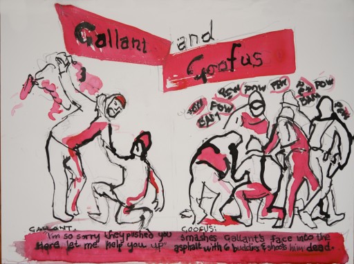 The original art (by a woman!) was in that bland, somewhat fuzzy style that's since been replaced by the clean, single-outline even-weighted line look you now see in every illustrated manual ever, and I thought about replicating that; but it didn't fit my mood. I s'pose I'm not a very kind person, cuz who else would watch multiple videos of a man being shot dead with no more irritation at the sources cutting out the actual murder, cuz I wanted to get this right?