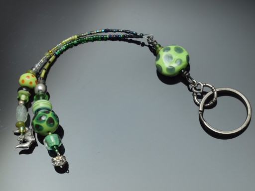 One of the reasons I'm assuming this is the large variety and spread of quality—everything from old rocaille bugles with half their silvering missing and large, globby clear colourless 8/0s to fancier-finished seads beads: it suggests I was trying to use up odds and ends. In a similar way, I incorporated random green beads, such as the orange dot and the misshapen spot & burnt out dichro in the tails; nevertheless I think it works together well, not hurt by using consistently dark findings—keyring, pewter toggle-ring & black iron wire.