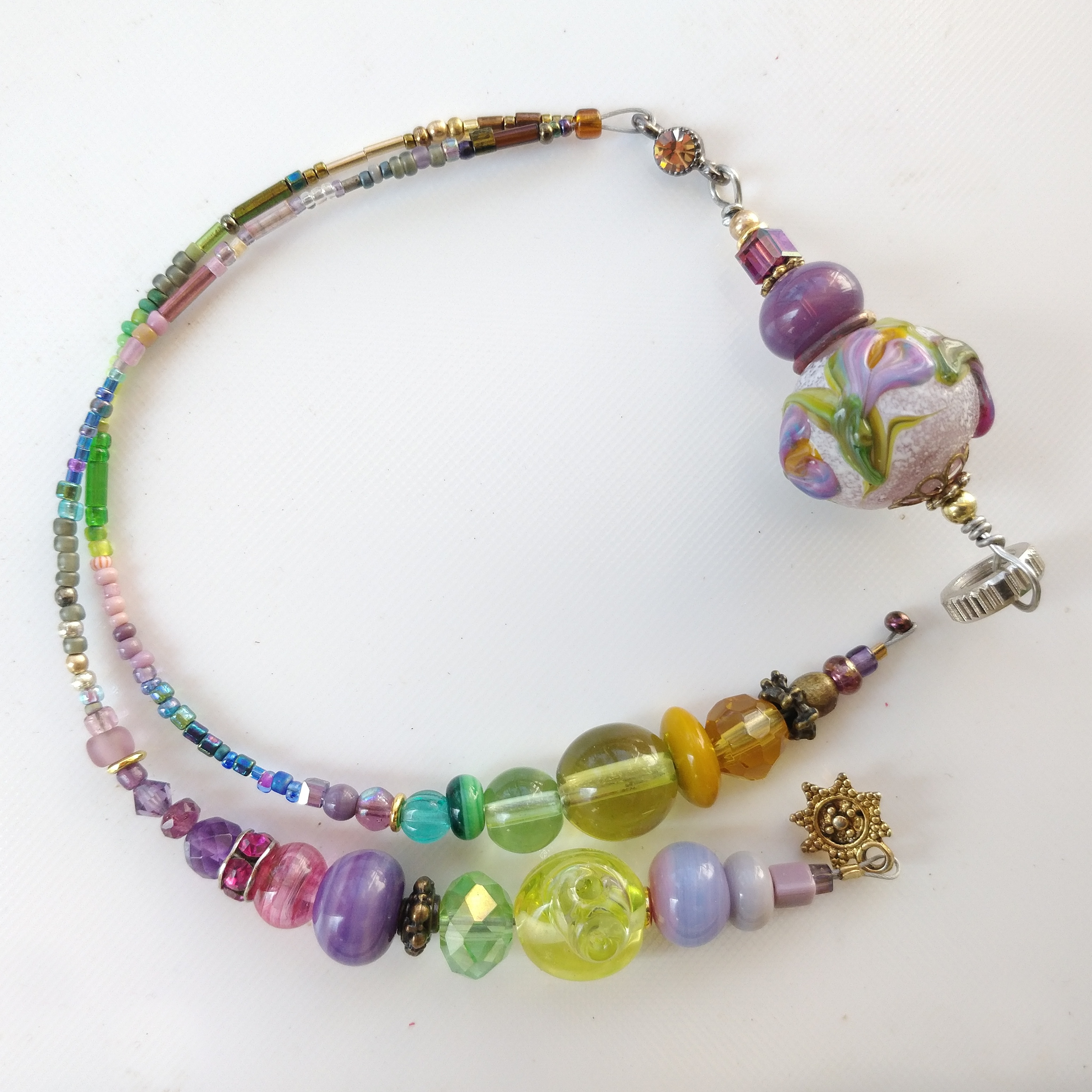 Dead mouse featuring floral trailing with thompson enamel background, roughly 17x19mm; assorted hollow stripeys, czech, chinese, and swarovski crystals; seed beads; malachite; base metal. Strung on beadalon with 316 stainless wirewrap, bicycle presta valve ring, length overall approximately 9-5/8". one plus phone camera, 12apr2022:10:56; f/1.7, 1/100s, ISO 200